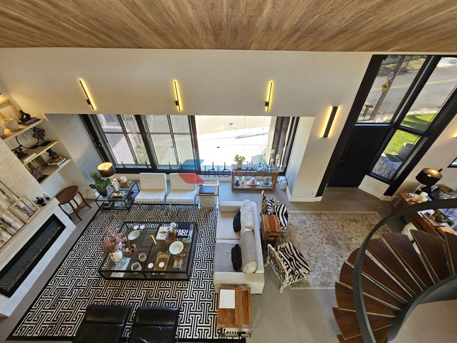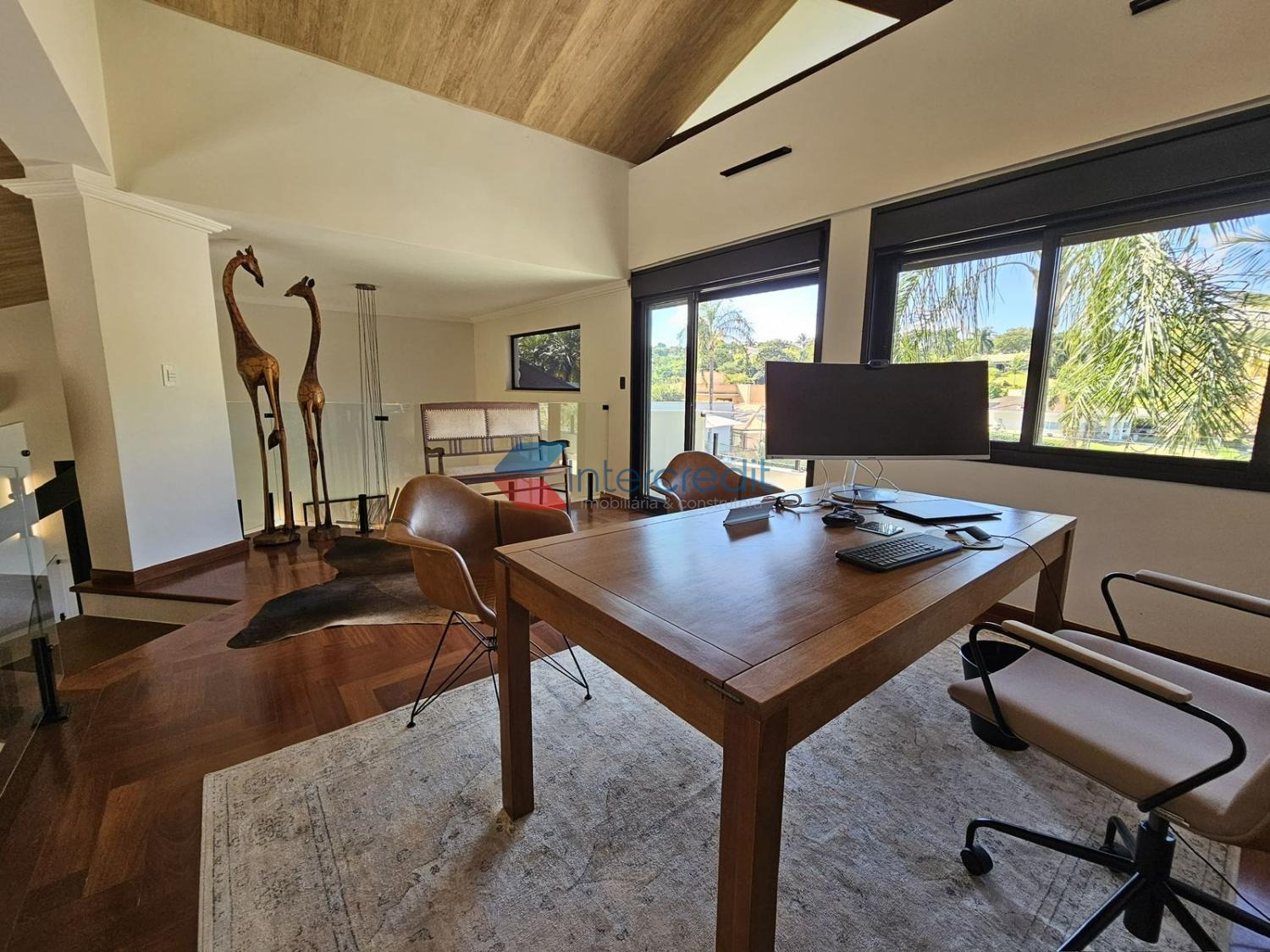 Uma escada moderna leva ao piso superior, onde está localizado um escritório com vista para o lazer.